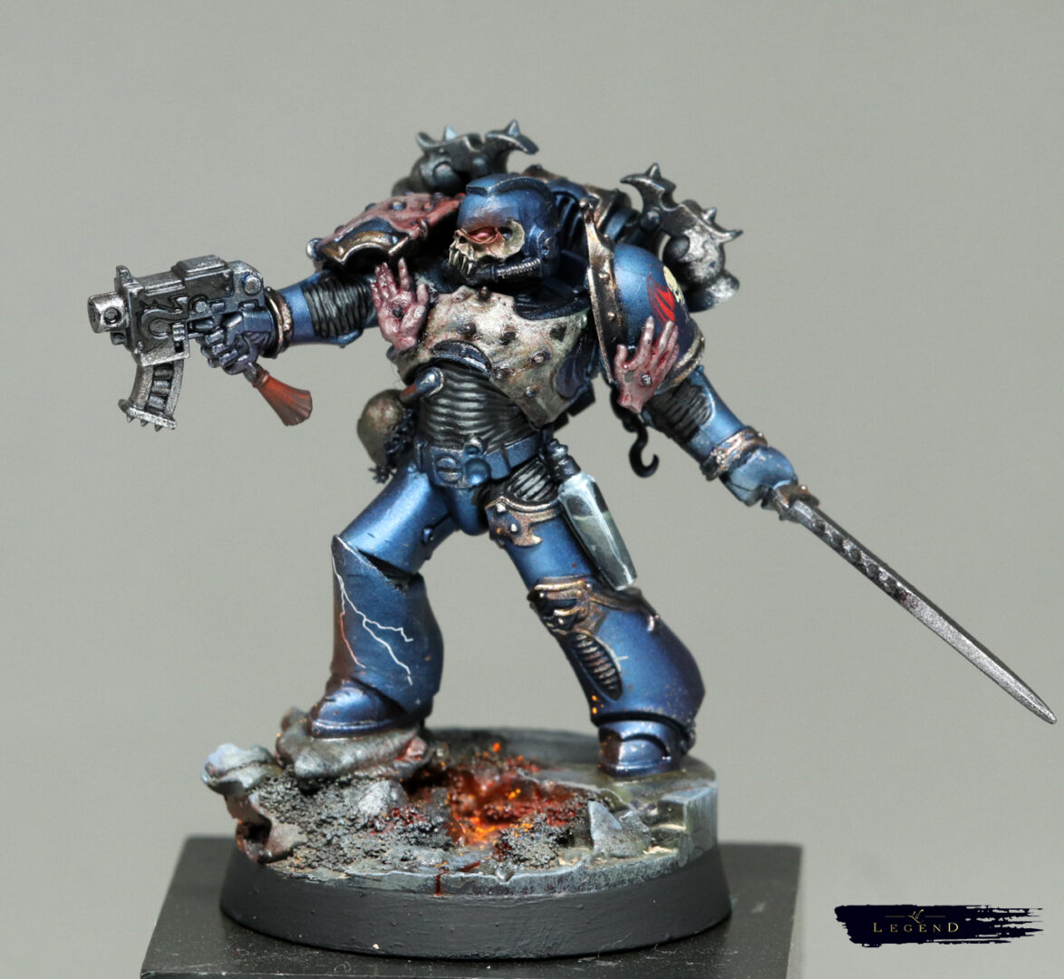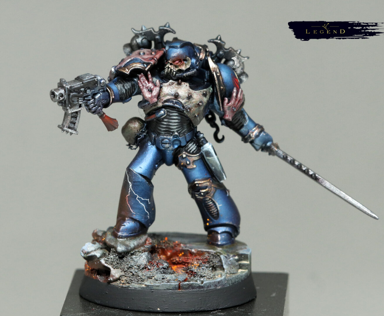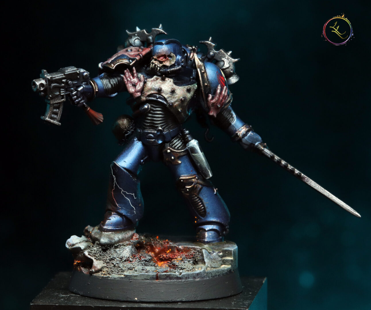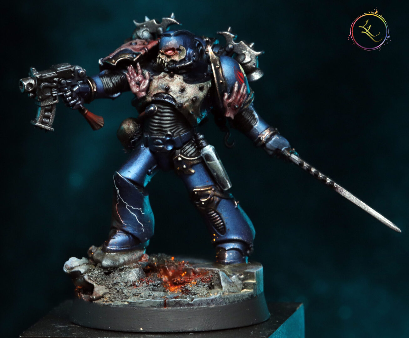 The conversion came together fast — elegant Slaaneshi armour lines meeting the brutal bulk of Heresy-era plate. But painting it took patience. The palette sits in that sweet spot between cold and electric: deep blues, purple undertones, and sharp, bone-white lightning marks. You have to fight the temptation to go too bright. The Night Lords live in shadow; everything should feel just a little sickly, just a little off.