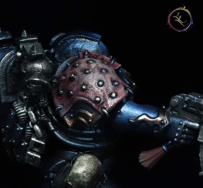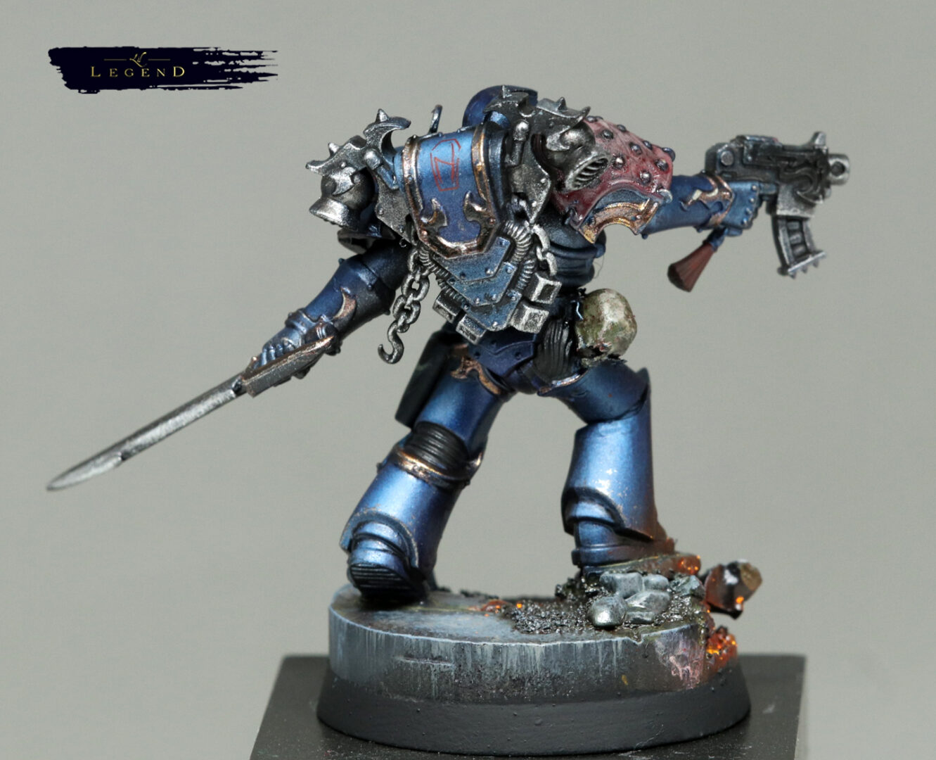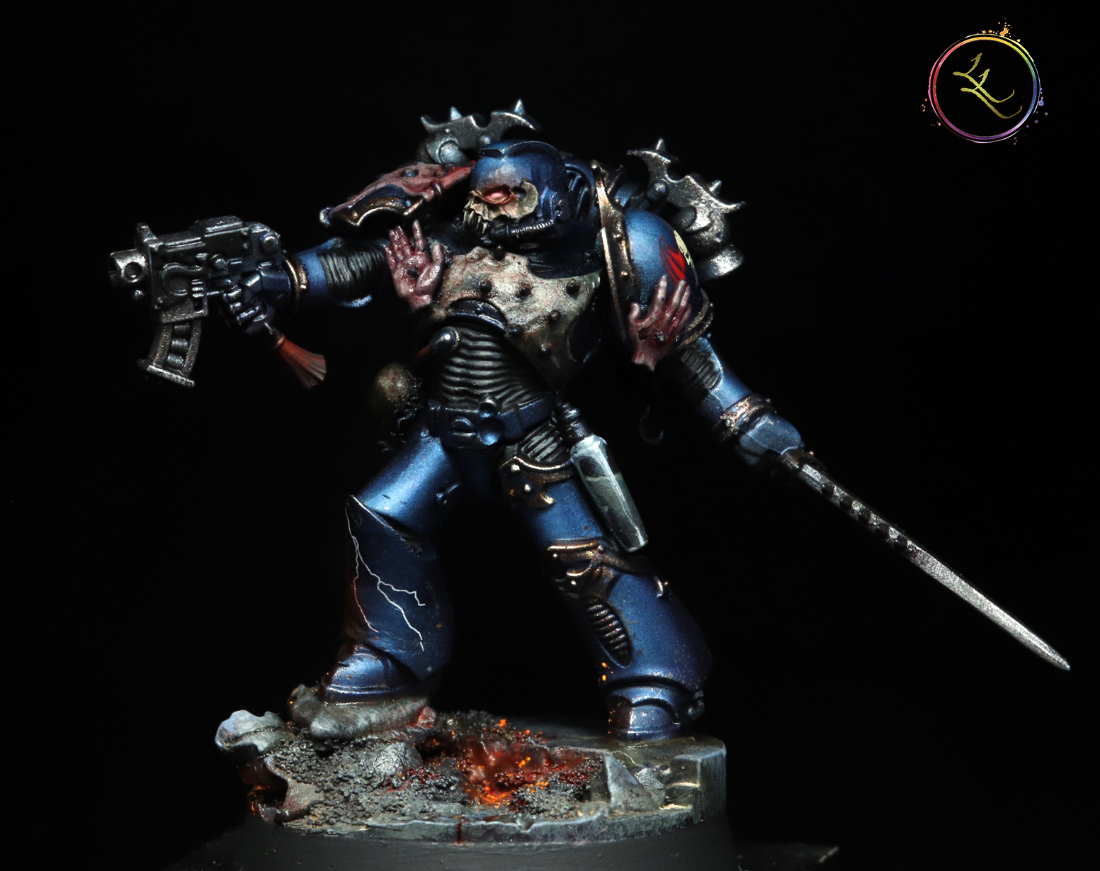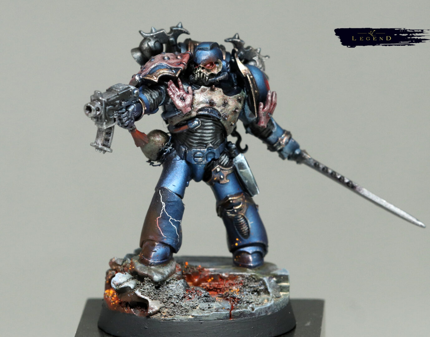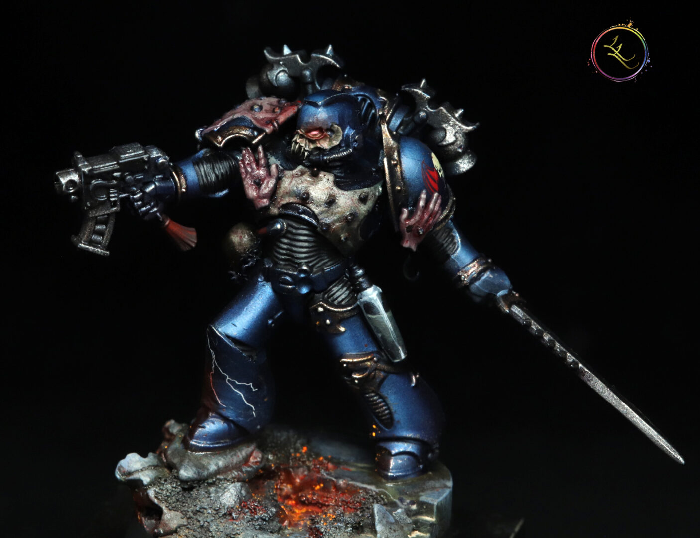 The conversion came together fast — elegant Slaaneshi armour lines meeting the brutal bulk of Heresy-era plate. But painting it took patience. The palette sits in that sweet spot between cold and electric: deep blues, purple undertones, and sharp, bone-white lightning marks. You have to fight the temptation to go too bright. The Night Lords live in shadow; everything should feel just a little sickly, just a little off.
