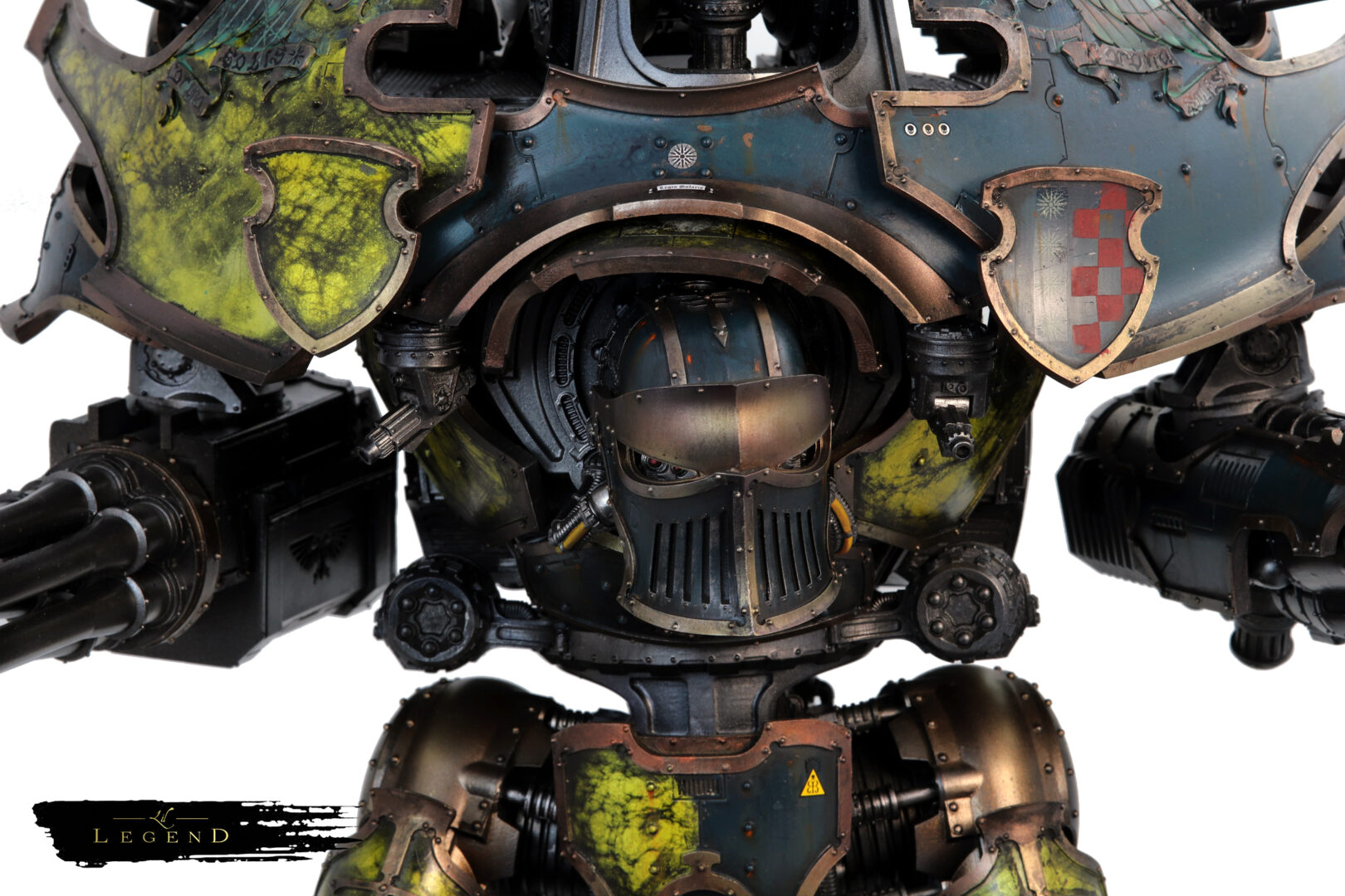 Rather than relying on solid blues, I went for an extensive marbling effect across the large panels — veins of lighter and darker tones running through the surface like living stone. It gives the Titan a sense of age and ceremony, as if each plate were carved from ancient material rather than forged. Like many ships built in the age of sail, this machine isn’t purely about function – it’s a statement of empire. This is what is possible; this is what, as a species, we can achieve. Nothing in Warhammer 40k is purely