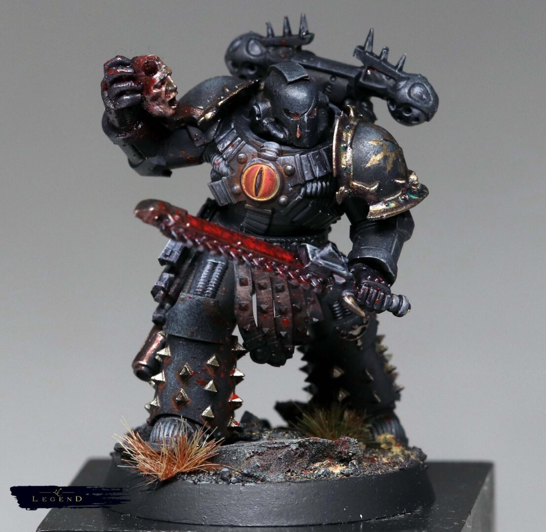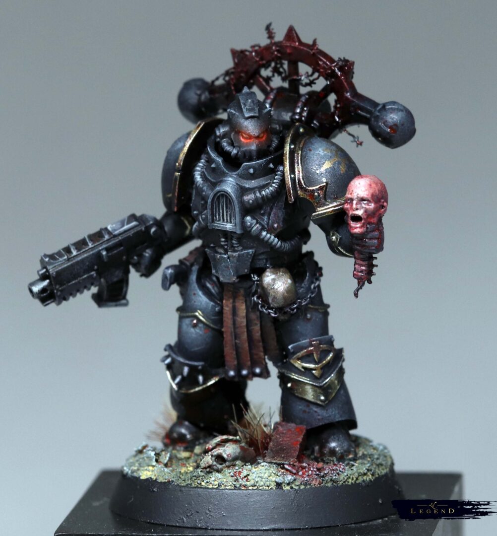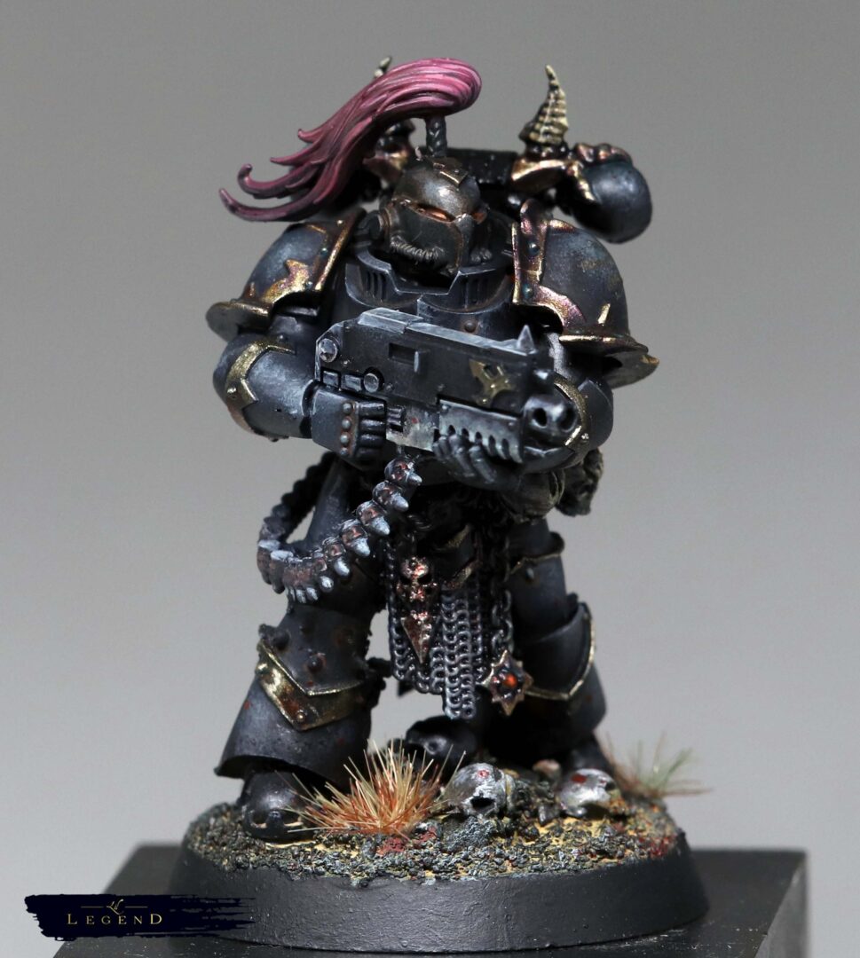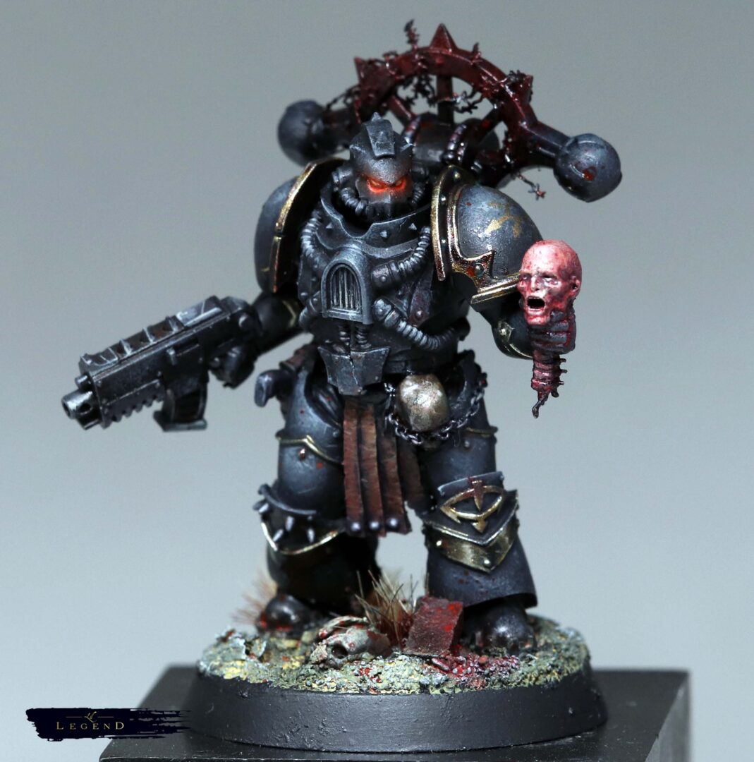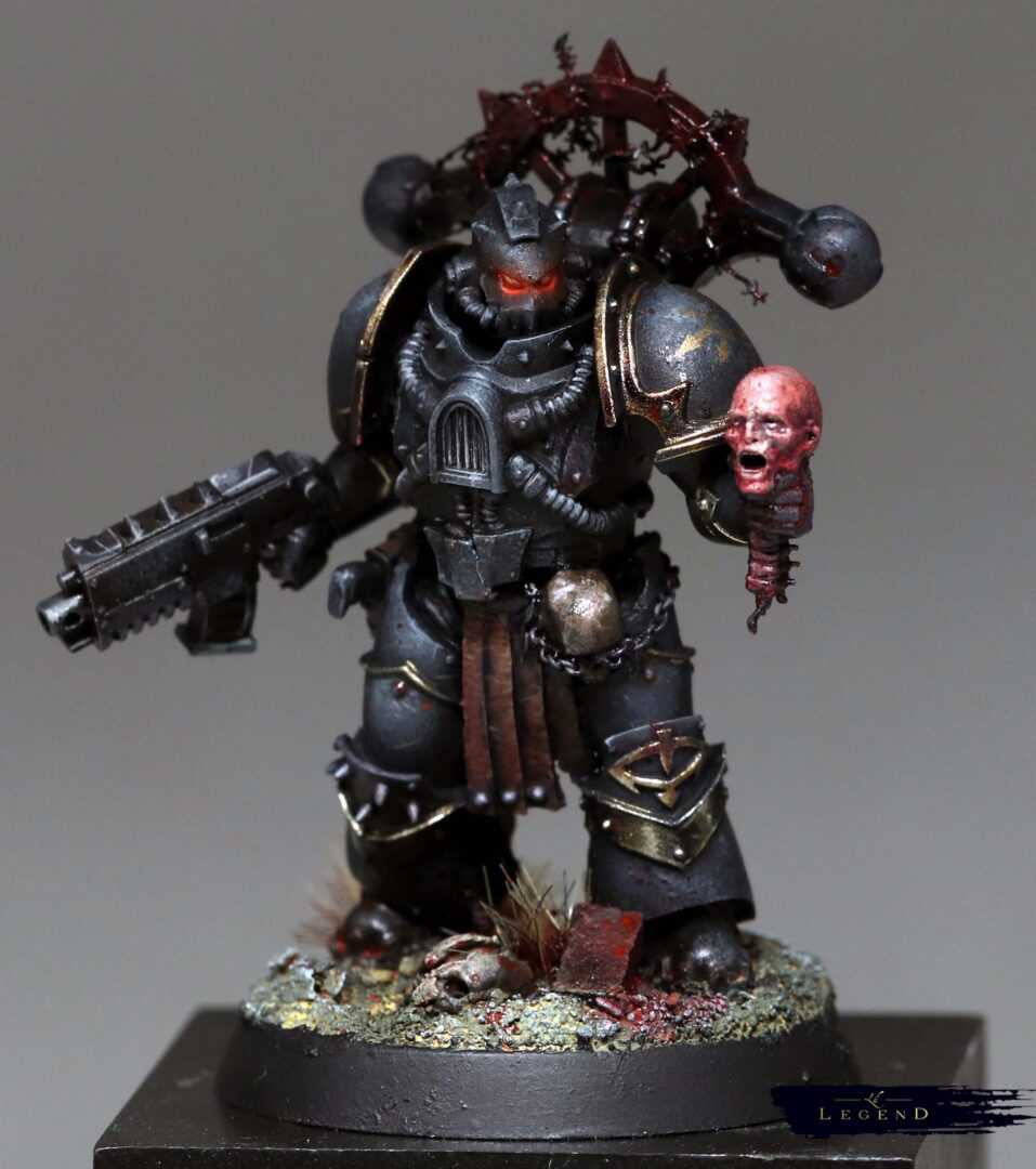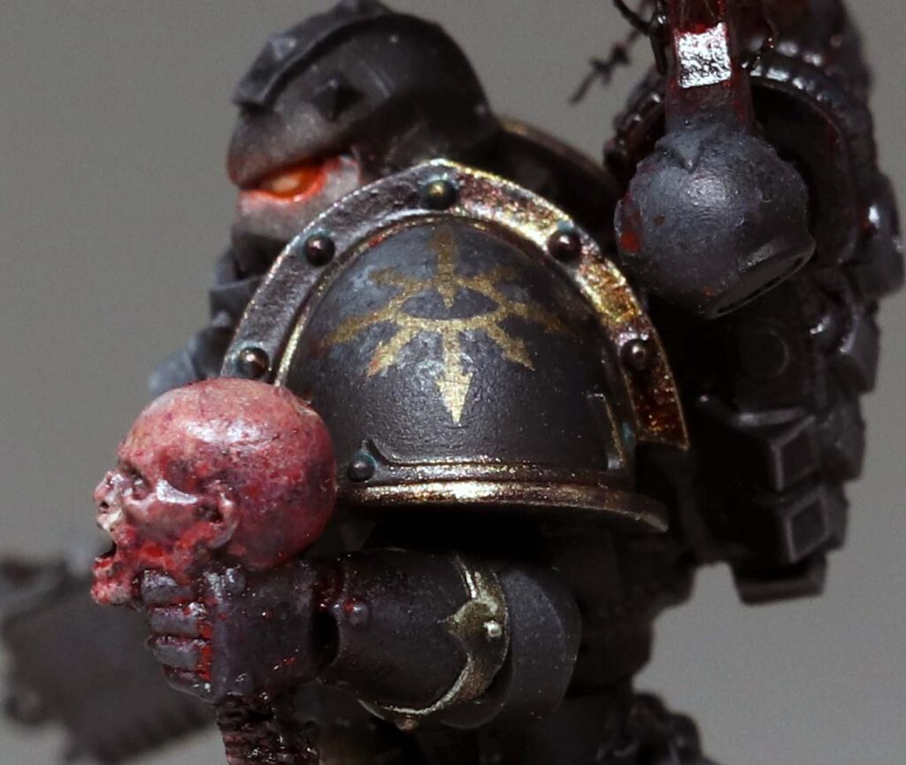 This is the first basic squad I’ve done for the Black Legion project – an attempt to collect and paint an army for 10th edition 40k. With 11th on the horizon I look forward to painting another unit for the advent of 12th ed! I wanted to push the melting pot feel of the legion, and present the viewer a quetion – what is the parent legion of this warrior? There are suggestions, like the Blood Angel helmet, which reminds me of a piece of lore where Abaddon took the geneseed of the dead of Mackan to create new Black Legion. Or the unusual humour of Kereddax, jiggling a severed head, repeating the idiot refrain: ‘the planet broke before the guard.’