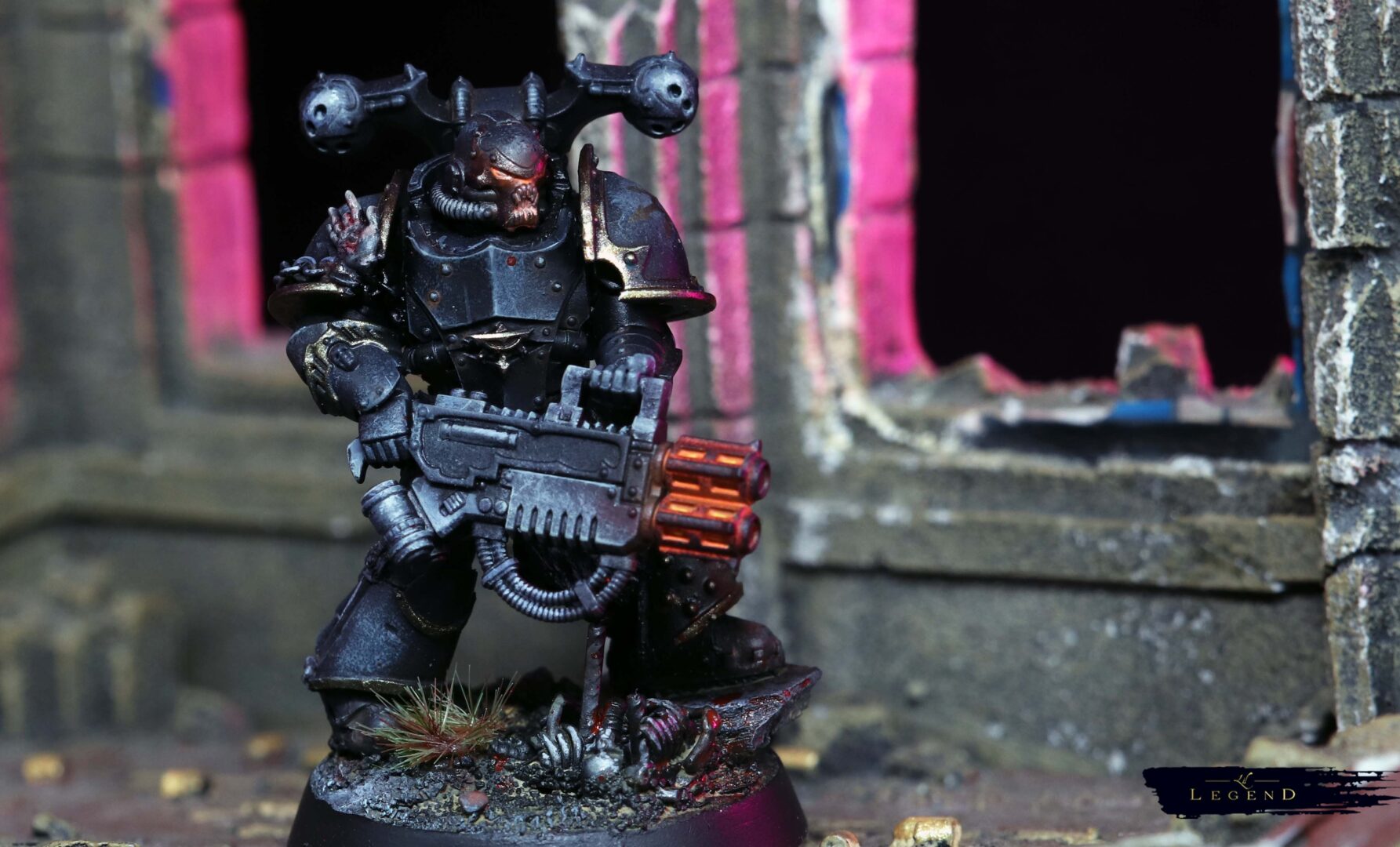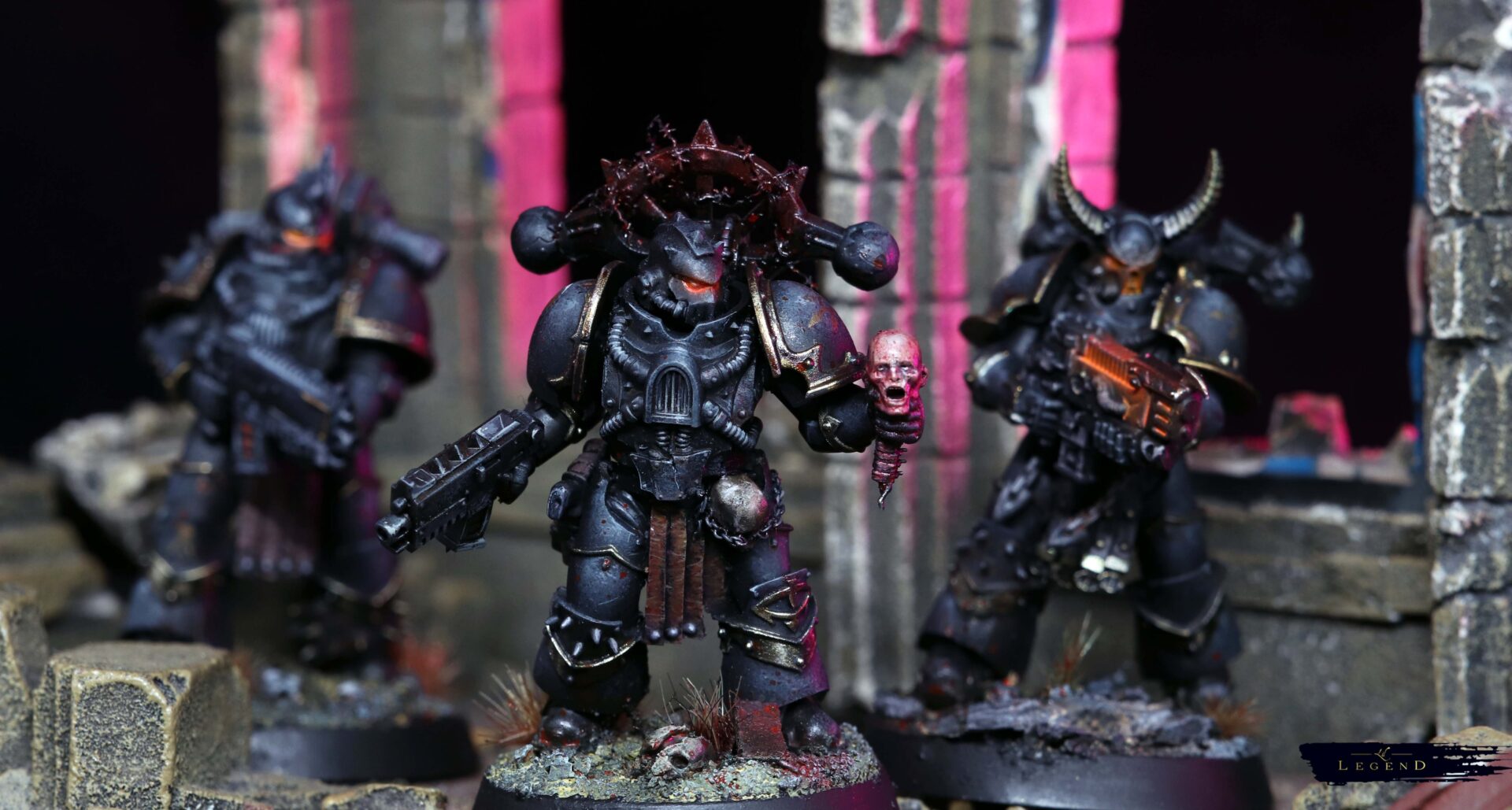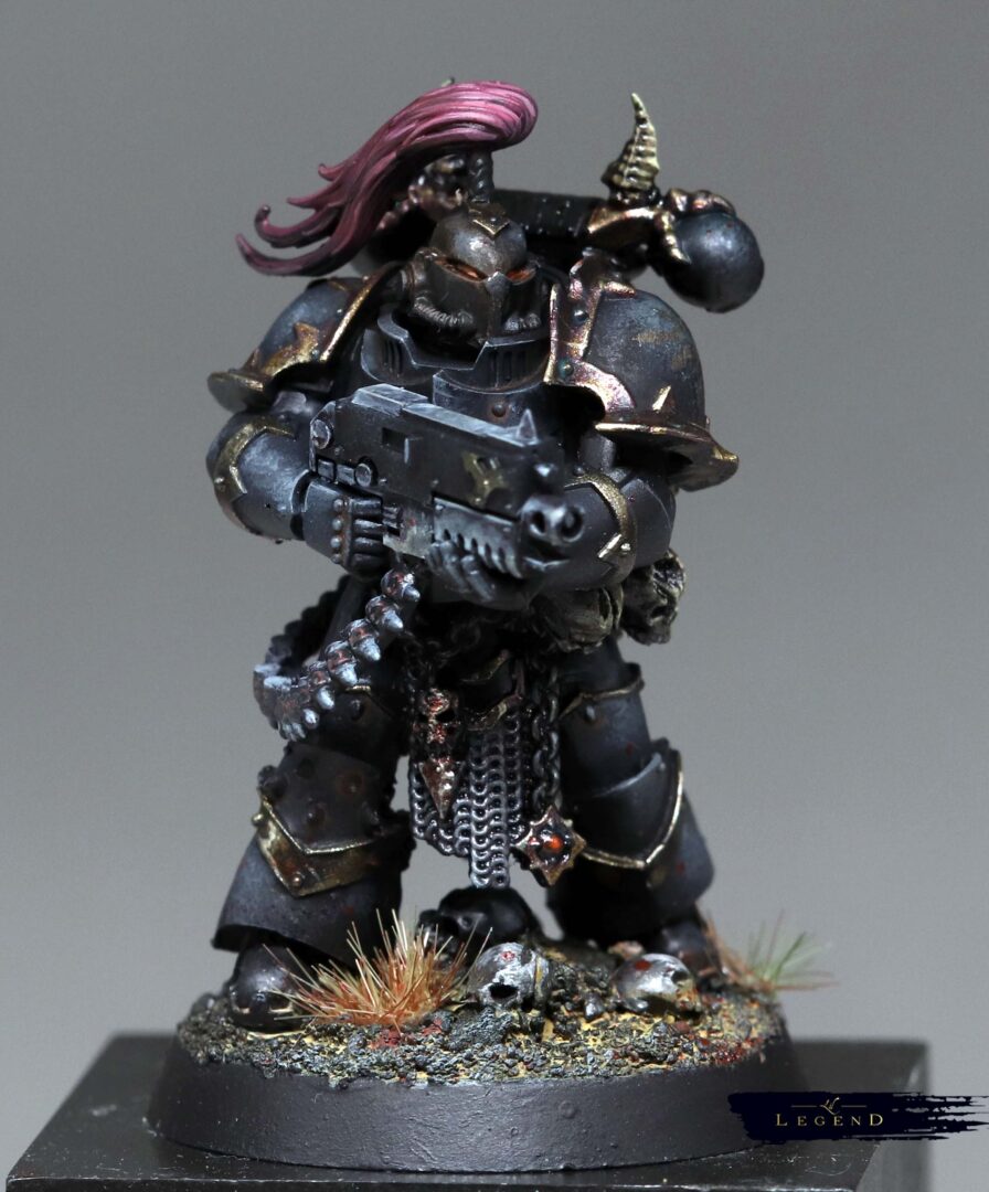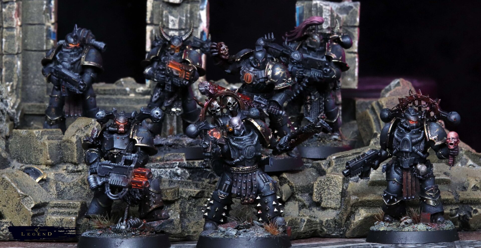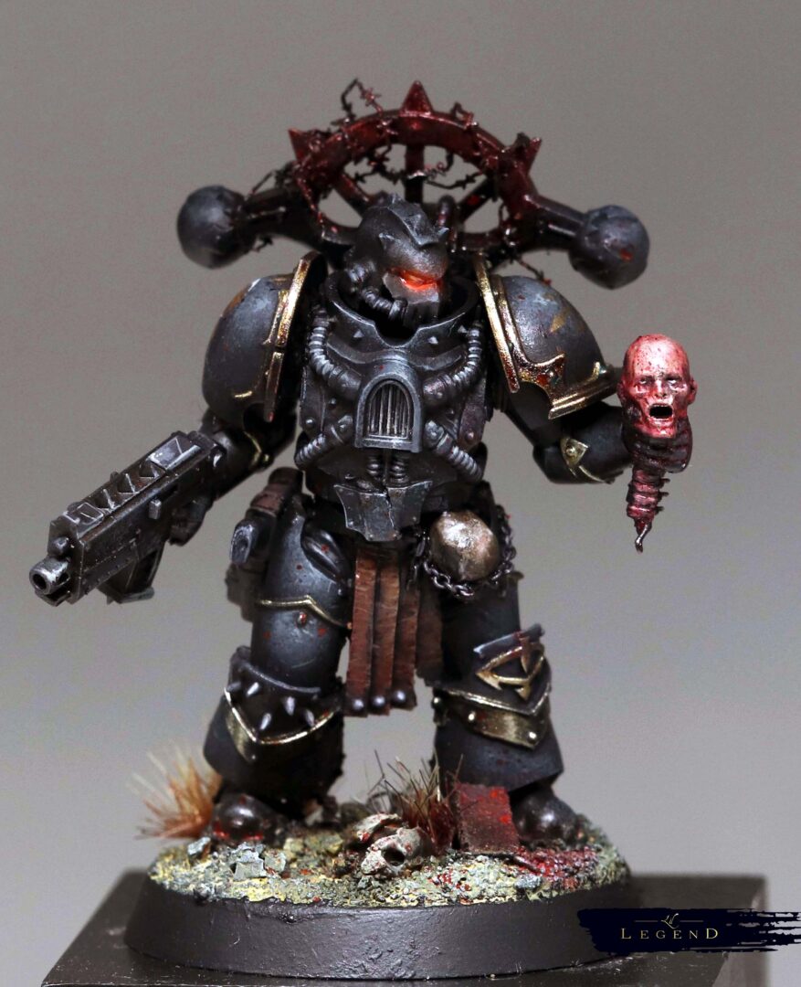 This is the first basic squad I’ve done for the Black Legion project – an attempt to collect and paint an army for 10th edition 40k. With 11th on the horizon I look forward to painting another unit for the advent of 12th ed! I wanted to push the melting pot feel of the legion, and present the viewer a quetion – what is the parent legion of this warrior? There are suggestions, like the Blood Angel helmet, which reminds me of a piece of lore where Abaddon took the geneseed of the dead of Mackan to create new Black Legion. Or the unusual humour of Kereddax, jiggling a severed head, repeating the idiot refrain: ‘the planet broke before the guard.’