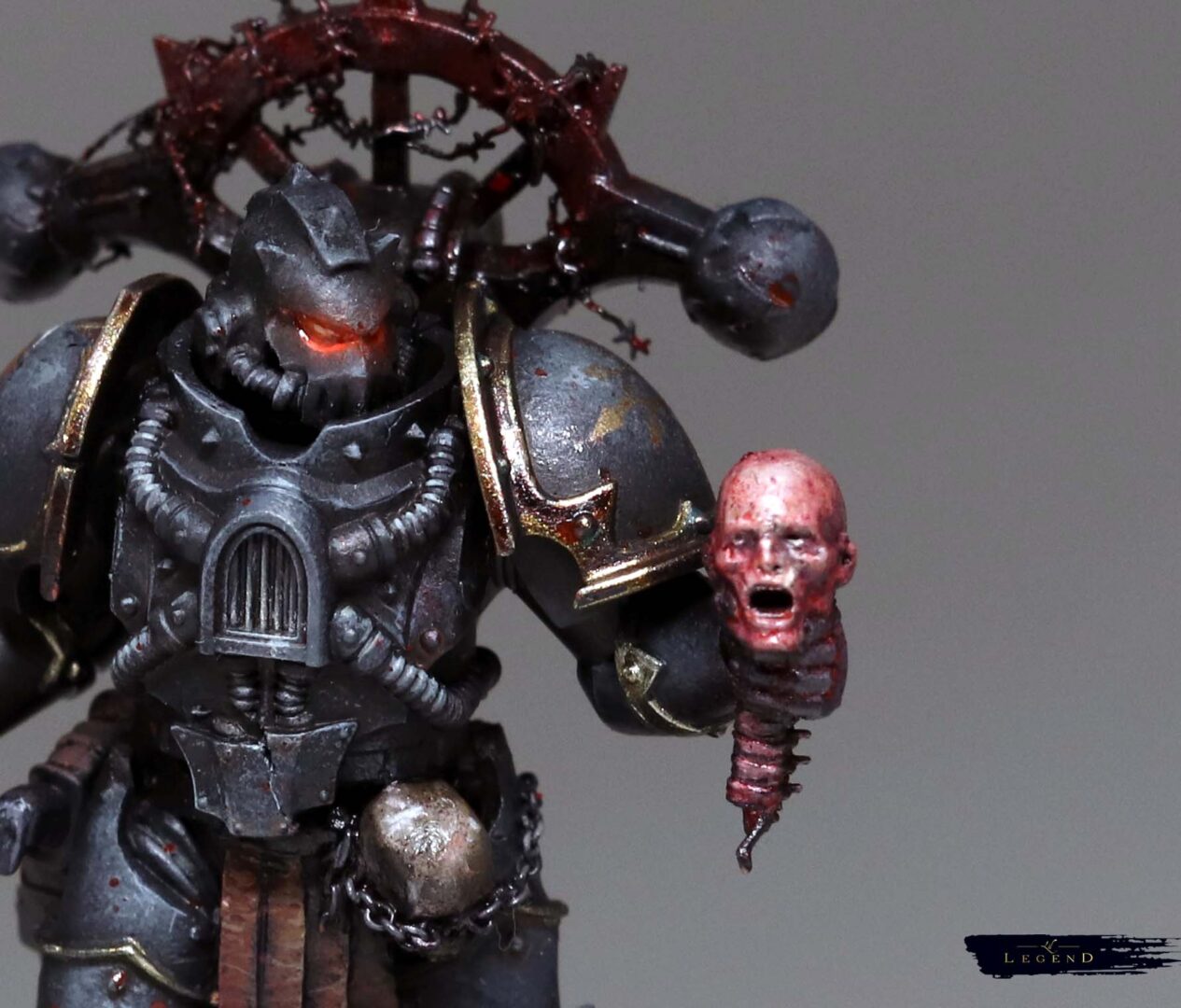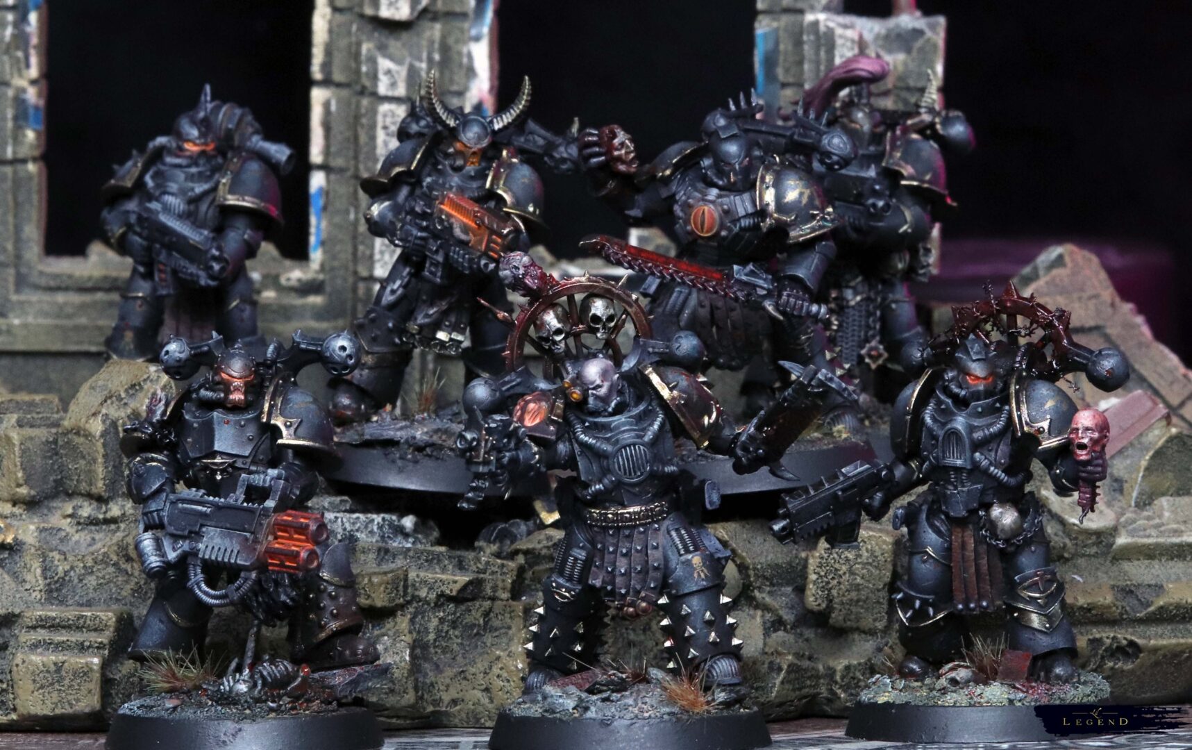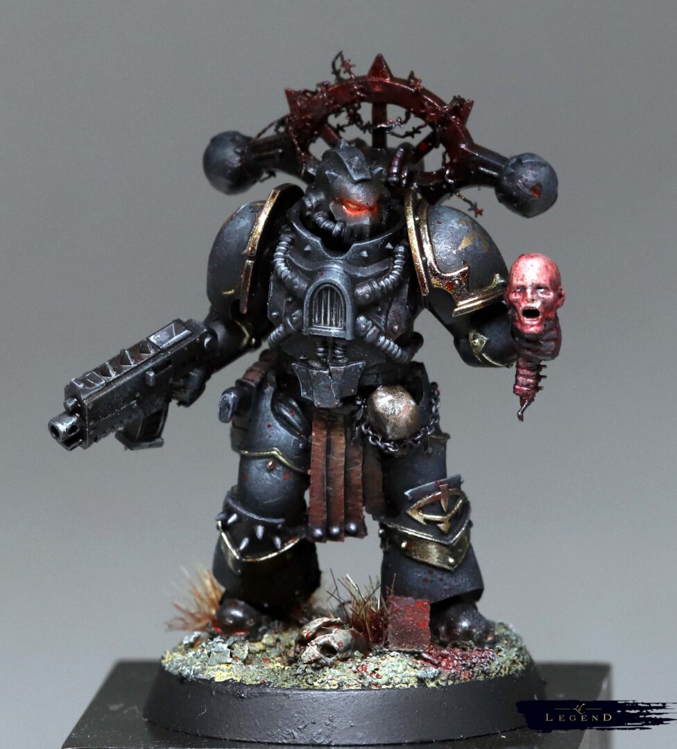 Reading the books, especially the excellent Night Lords series by ADB, I’d envision warriors in creaking, ancient armour. Canibalised armour marks, mismatched, bastard machine spirits warring with the incumbent Legionnaires. Marines that constantly harp on about the good ol’ days, rooting thier legend within the Siege of Terra (side note of internal lore – I imagine most Chaos Marines are full of shit, and weren’t at the siege – most would have been created afterward, but need to locate themselves in a mythology not of thier own. You can tell which models within my force are Heresy Era Marines on whether they use Forge World legs or not. If they have Forge World, they were present at Terra.)
