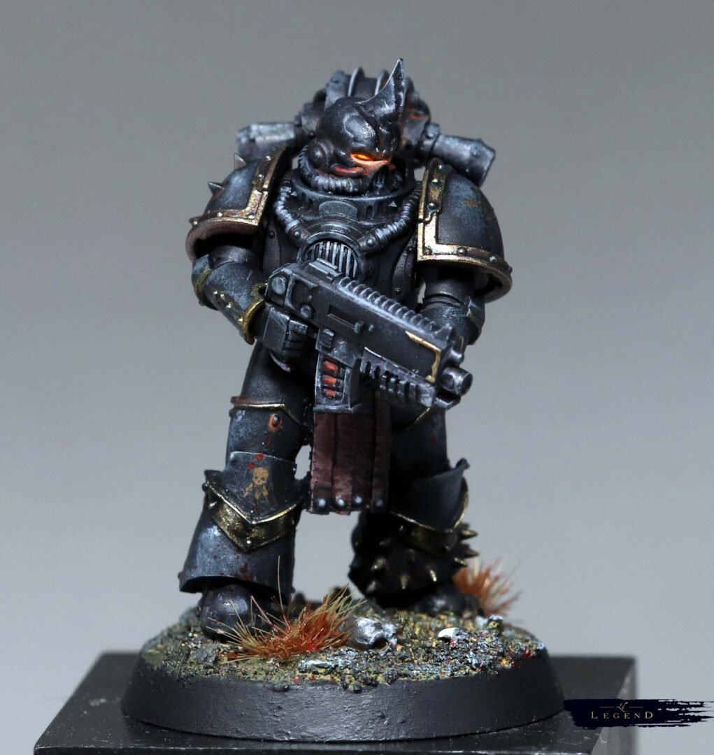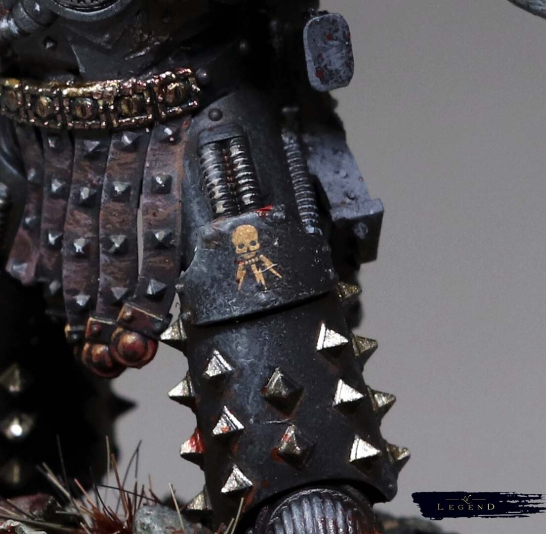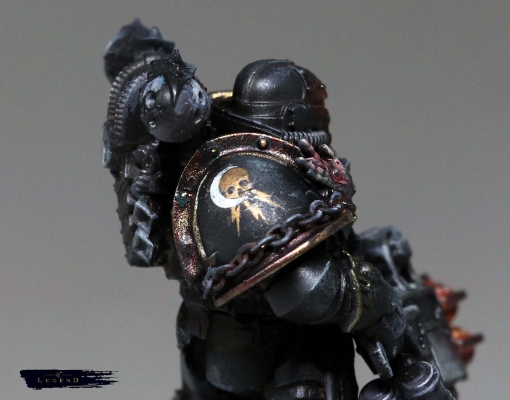 Armour pattern irregularities and gene-markers suggest multiple Legion origins. XVIth and IVth lineage is probable; VIIIth indicators are present in helm configuration and sensory augmentation. Prior heraldry has been systematically removed. The only consistent marking is the sable field, and Lighting marked Death’s Head, framed by a crescent moon. Individual identity appears intentionally suppressed in favour of functional cohesion.