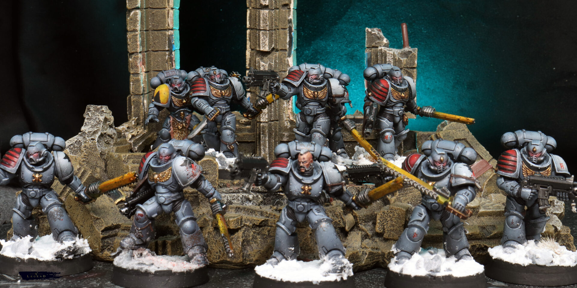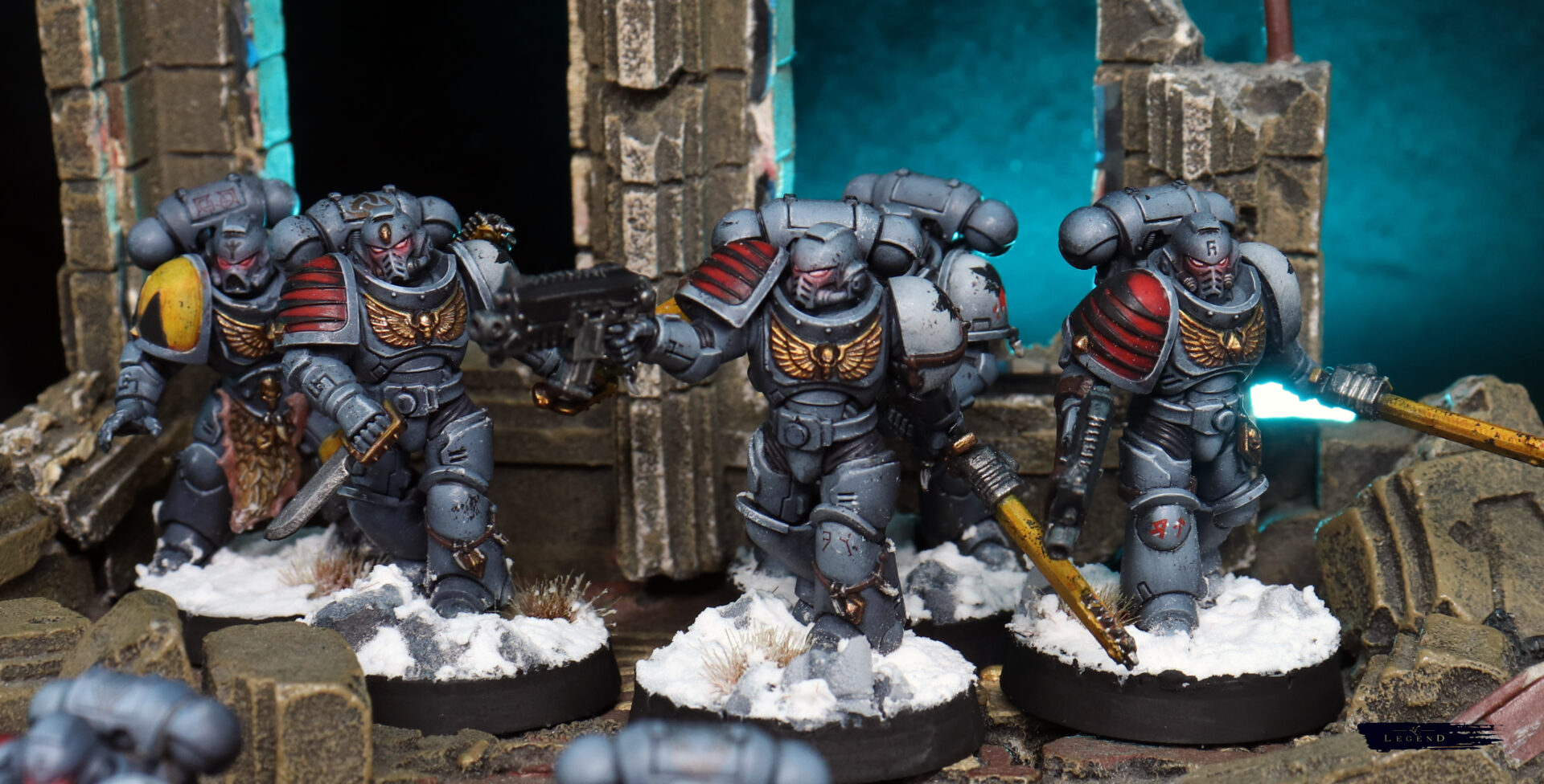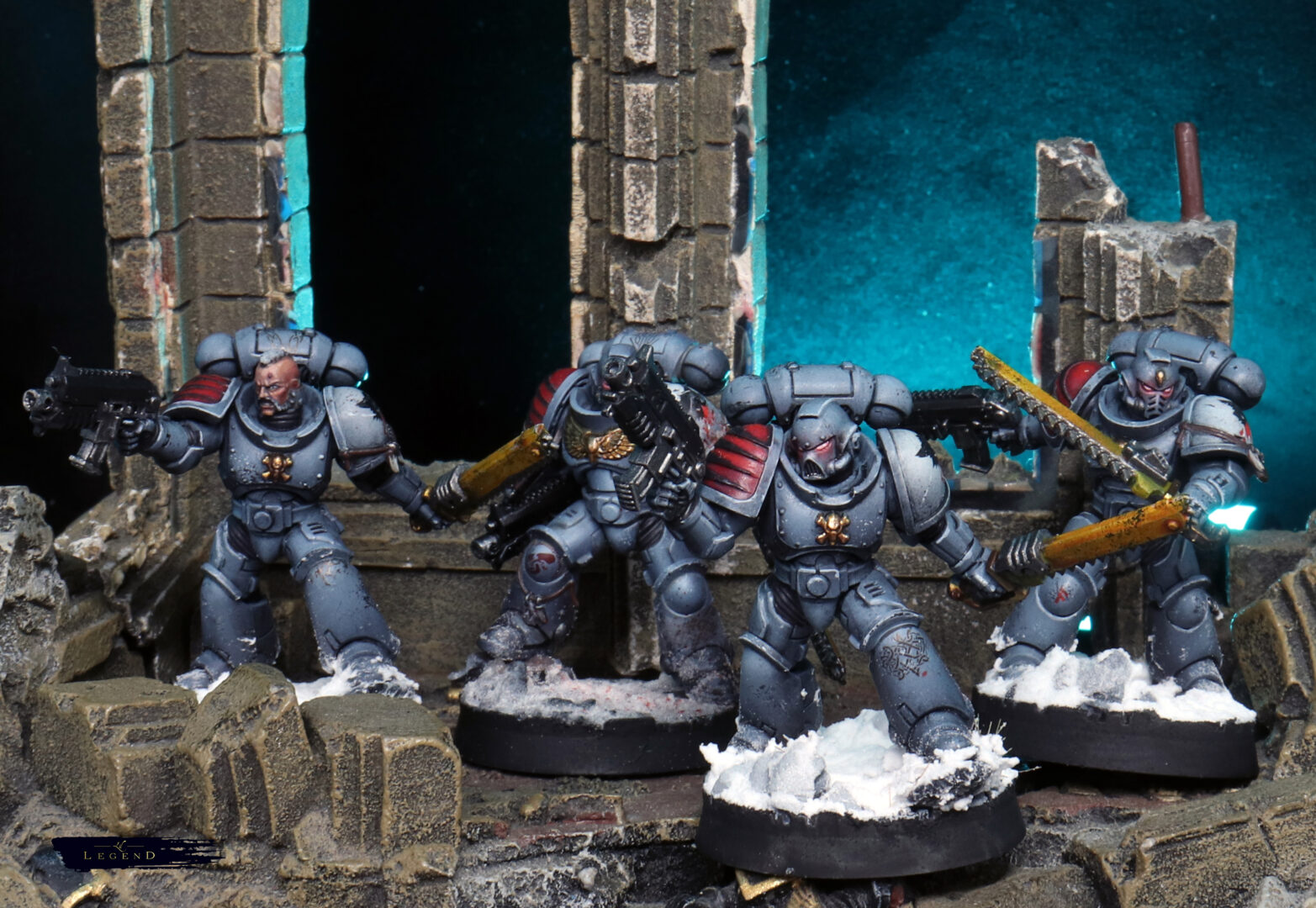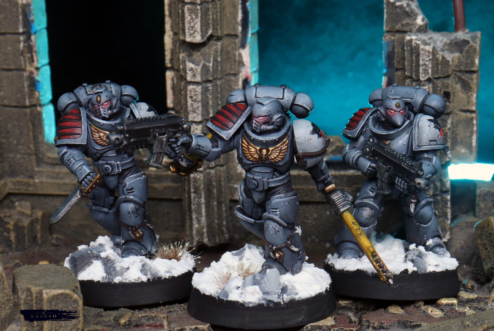 Weathering was kept restrained. A few chips on the edges, some dust on the lower legs — enough to suggest campaign wear without turning them into a different Legion entirely. Space Wolves benefit from clarity. Too much grime and they lose their identity.